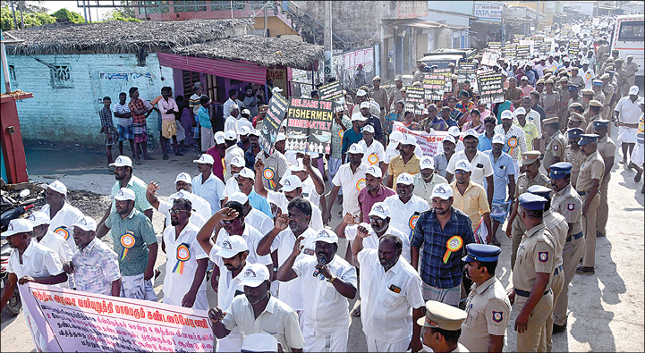 வேலைநிறுத்தத்தின் 4-வது நாளான நேற்று ராமேசுவரம் மீன்பிடி இறங்குதளத்திலிருந்து பேரணியாகச் சென்று, ராமநாதபுரம் ஆட்சியர்அலுவலகத்தை முற்றுகையிட்டுப் போராட்டம் நடத்த திட்டமிட்டிருந்தனர்.அதன்படி நடைபெற்றஇந்தப் பேரணியில் பெண்கள் உட்பட 1,000-க்கும் மேற்பட்ட மீனவர்கள் பங்கேற்றனர். பேரணி பாம்பனை அடைந்தபோது, ராமநாதபுரம் ஆட்சியர் பா.விஷ்ணு சந்திரன் மீனவர்களை சந்தித்து, பேச்சுவார்த்தை நடத்தினார். அப்போது, மீனவர்களை விரைவில் விடுதலை செய்ய அனைத்து நடவடிக்கைகளும் மத்திய, மாநில அரசுகள் மூலம் மேற்கொள்ளப்படும் என்று அவர் உறுதி அளித்தார்.