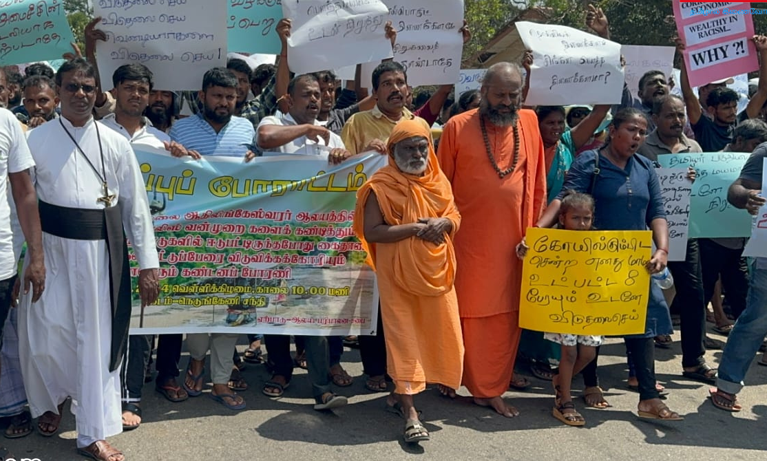 வெடுக்குநாறிமலை ஆதிசிவன் ஆலயத்தில் கடந்த சிவராத்திரி தினத்தன்று பொலிஸார் மேற்கொண்ட அத்துமீறலை அடுத்து கைது செய்யப்பட்ட பூசகர் உள்ளிட்ட 8 பேருக்கும் நீதி கோரியே வவுனியாவில் இன்று பொதுமக்களால் போராட்டமொன்று முன்னெடுக்கப்பட்டது.