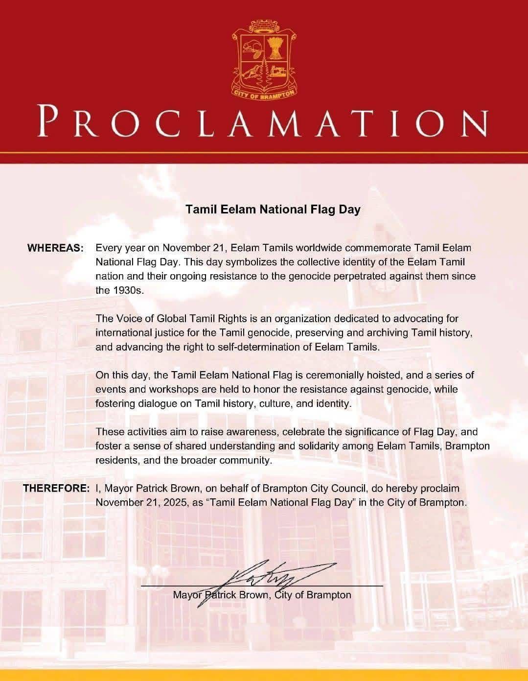 கனடாவின் Brampton நகரம் தமிழீழத் தேசியக்கொடியை தமிழர்களின் கொடியாக அங்கிகரித்துள்ளது.