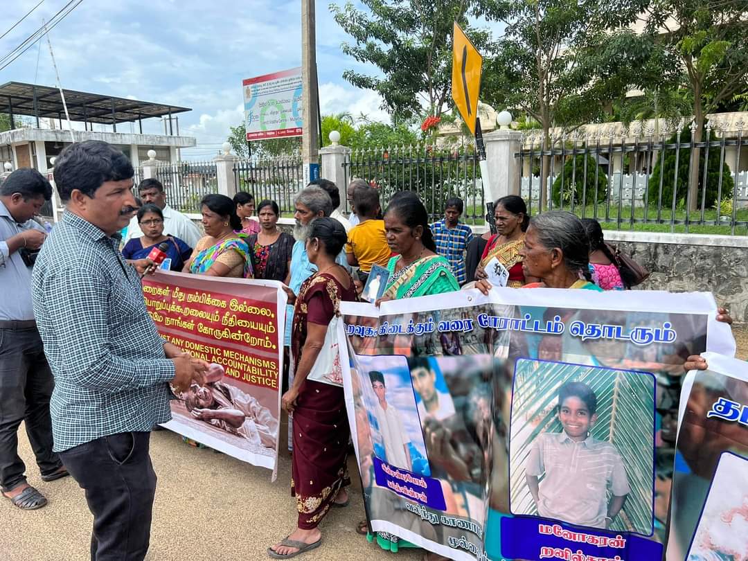 முல்லைத்தீவு மாவட்ட வலிந்து காணாமல் ஆக்கப்பட்ட உறவுகளின் சங்கத்தின் ஏற்பாட்டில் இன்று காலை முல்லைத்தீவு புனித இராஜப்பர் தேவாலயத்திற்கு முன்பாக ஆரம்பமாகிய ஆர்ப்பாட்ட பேரணியானது முல்லைத்தீவு மாவட்ட செயலகத்திற்கு முன்பாக சென்று குறித்த பேரணியானது நிறைவு பெற்றிருந்தது.
