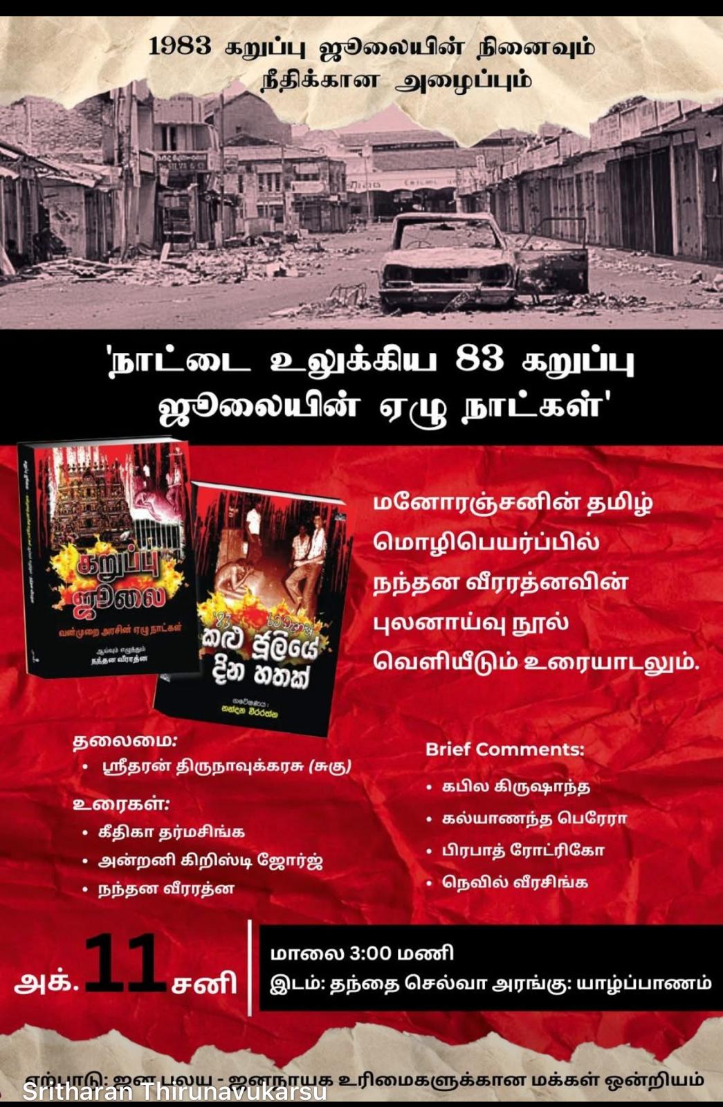 இரண்டு விளம்பரங்களை பார்த்தேன் 1983 கறுப்பு யூலையின் நினைவும், நீதிக்கான அழைப்பும் என்ற தலைப்பிட்டு நந்தன வீரரத்தன வின் சிங்கள மொழியிலான புத்தகத்தை மனோ ரஞ்சனின் தமிழ் மொழிபெயர்பில் கடந்த வியாழன் 2025 செப்டம்பர் 09 ல் கொழும்பு மகாவலி மைய கேட்போர் கூடத்திலும், இன்று சனிக்கழமை 2025 செப்டம்பர் 11ல் யாழ்ப்பாணம் தந்தை செல்வா அரங்கிலும் ஜனநாயக உரிமைக்கான மக்கள் ஒன்றியம் என்ற அமைப்பின் ஏற்பாட்டில் இடம் பெற்றது.