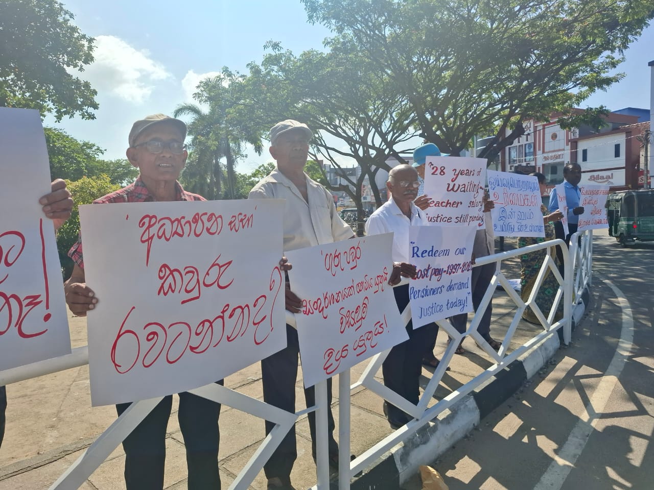 ஆசிரியர்களுக்கும், அதிபர்களுக்கும் சமத்துவமான ஓய்வூதியம் வேண்டும், ஆசிரியர் சம்பள முரண்பாடு தீர்க்கப்படாமல் 28 வருடங்கள் கடந்துள்ளன, ஓய்வூதிய முரண்பாட்டை தீர்க்க அரசிடம் தீர்க்க அரசிடம் நீதி கோருவோம் போன்ற கோரிக்கைகளை முன்வைத்து ஆர்ப்பாட்டத்தில் ஈடுபட்டனர்.